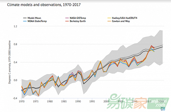 航空航天局、美國國家海洋和大氣管理局、HadCRUT、Cowtan and Way以及美國獨立研究機構“伯克利地球” 圖片來源:Carbon Brief