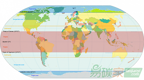 世界地理分區。北回歸線至南回歸線之間的區域(紅色陰影區域)為熱帶地區,當地人口占世界人口的40% 圖片來源:Maulucioni/Wikipedia, CC BY-SA