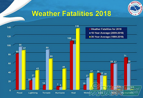 美國2018年的天氣災害致死人數(紅色柱狀),以及過去10年(藍色柱狀)和過去30年(黃色柱狀)間的平均死亡人數 圖片來源:National Weather Service, CC BY