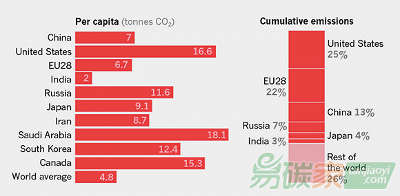 各國人均年二氧化碳排放量和總排放量。數據來自全球碳計劃組織 圖片來源:Nature