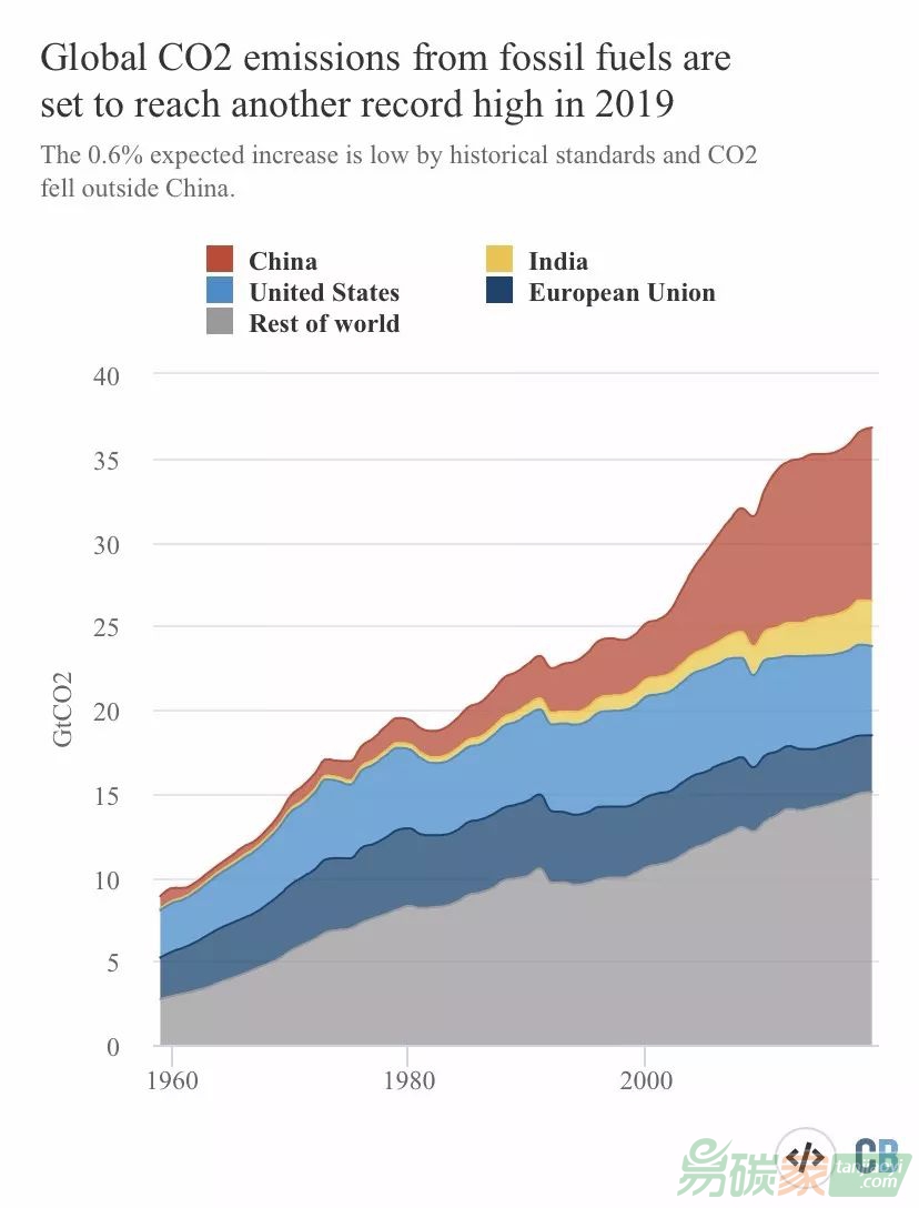 根據Global Carbon Program(GCP)的最新估計,2019年全球化石燃料和工業(FF&I)的排放量將達到368.1億噸二氧化碳,僅比2018年的水平僅增加2.4億噸(+0.6%) 。而2019年全球排放量的增長基本完全來自于中國,中國的二氧化