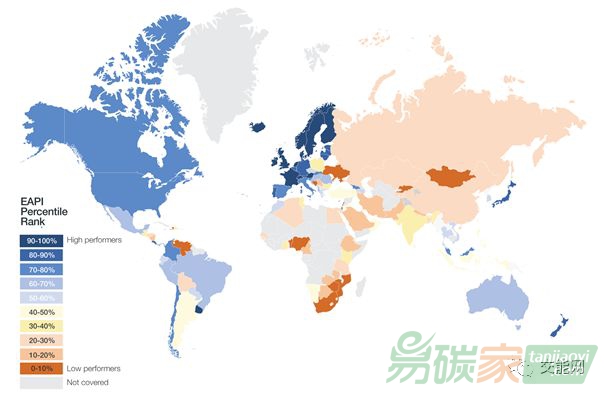從圖中可以看出北歐三國以及英法等歐洲國家的能源轉(zhuǎn)型水平較高,美洲國家其次,而亞洲地區(qū)和非洲地區(qū)的大部分國家的能源轉(zhuǎn)型水平較低。