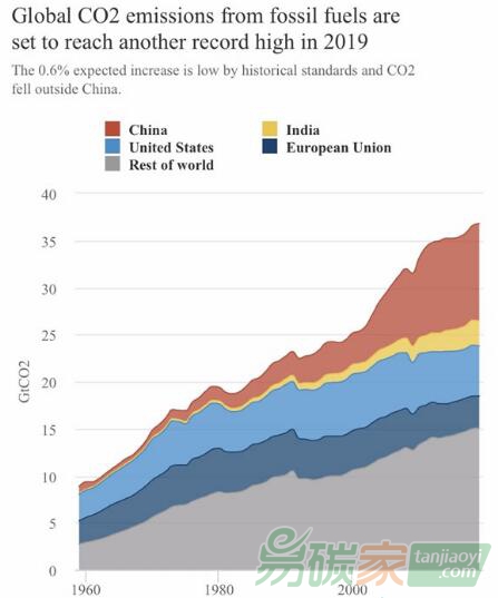 根據(jù)Global Carbon Program(GCP)的最新估計(jì),2019年全球化石燃料和工業(yè)(FF&I)的排放量將達(dá)到368.1億噸二氧化碳,僅比2018年的水平僅增加2.4億噸(+0.6%) 。而2019年全球排放量的增長基本完全來自于中國,中國的二氧化