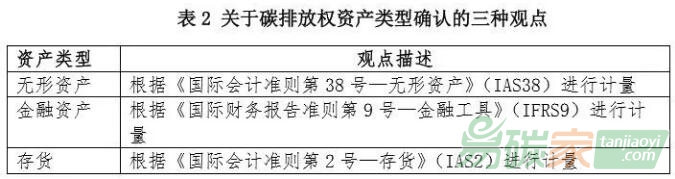 國(guó)際上對(duì)于將碳排放配額確認(rèn)為“資產(chǎn)”已基本形成了統(tǒng)一意見(jiàn),但是對(duì)于對(duì)應(yīng)的資產(chǎn)大類(lèi)下的具體分類(lèi)并未明確,目前主要有三種不同的觀點(diǎn),即無(wú)形資產(chǎn)、金融資產(chǎn)和存貨(見(jiàn)表2)。