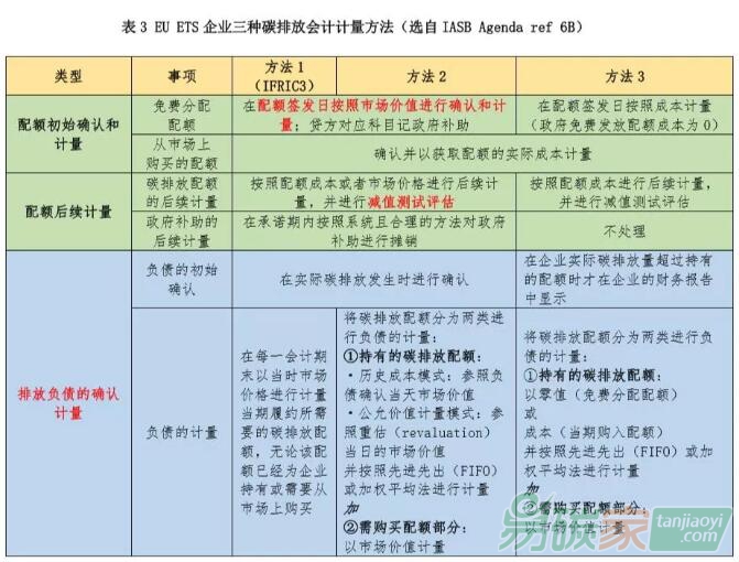 從賬務(wù)處理的角度來(lái)看,關(guān)鍵差異在于以下三點(diǎn):一是是否將企業(yè)的實(shí)際排放或者超額排放確認(rèn)為企業(yè)當(dāng)期的負(fù)債;二是是否對(duì)免費(fèi)分配的配額進(jìn)行賬務(wù)處理;三是是否參照當(dāng)期配額公允價(jià)值對(duì)資產(chǎn)負(fù)債表和利潤(rùn)表中的相關(guān)內(nèi)容進(jìn)行調(diào)整。