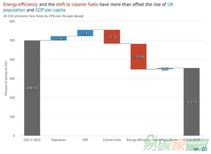 英國二氧化碳排放的下降主要靠能效的提高和低碳能源替代。與2010年(碳排放4.98億噸)相比,因為人口增加導(dǎo)致碳排放增加2240萬噸、經(jīng)濟(jì)增長導(dǎo)致碳排放3280萬噸,而低碳能源替代導(dǎo)致碳排放下降7250億噸,而能效的提高導(dǎo)致碳排放下降高達(dá)1.33億噸。