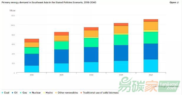 國際能源署(IEA)發布的《東南亞能源展望2019》報告指出,從2018到2040年,滿足一次能源需求的主要資源仍然是煤炭、石油和天然氣等化石能源。這22年間,一次能源需求增加58%,但是化石能源在能源系統中的占比從2018年的74%增加到2040年的76%。這顯然不是一個低碳能源轉型的路徑。實現低碳能源系統不僅可以通過極大減少二氧化