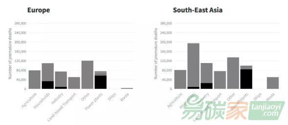“柳葉刀倒計時”(Lancet Countdown)致力于追蹤氣候變化和健康關系的研究進展,在其發布的2019年度報告中,依據全球疾病負擔和能源使用數據測算了不同行業對大氣污染導致的過早死亡的貢獻,圖2顯示了歐洲和東南亞兩個地區的對比,圖中黑色部分指煤炭使用導致的過早死亡,灰色指其他部門或行業導致的。在未來十年(2020-2030),如果東南亞空氣污染導致的年過早死亡人數希望降到歐洲目前的水平,以2016年為參考,即從過早死亡人數74萬降到53萬(根據圖2所提供的數據計算而出),需要在廢棄物管理、發電、陸地