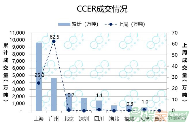 廣東市場配額交易量最高,共計成交54.4萬噸(含線下成交45萬噸),占各試點總成交量的90%;總成交額966萬元。