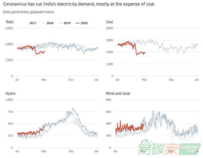 印度二氧化碳排放量的下降反映了自2019年初以來已經影響印度經濟的不利因素,以及可再生能源發電量的增加。此外,由于采取抗擊疫情的措施,3月份的二氧化碳排放降幅加大。