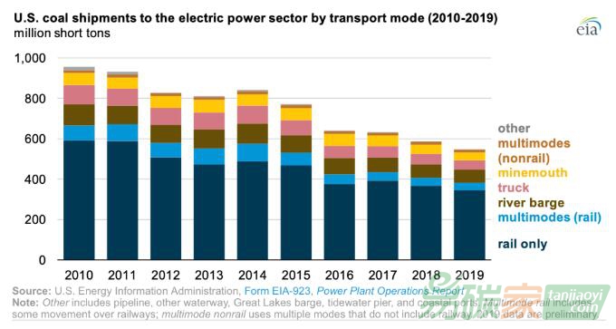 電力部門2019年接收煤炭5.47億噸,比2018年減少3800萬噸。2019年,煤炭發貨量連續第五年下降,降至2007年以來的最低值。2019年交付給美國電力部門的煤炭中,超過三分之二(69%)通過鐵路運輸;其余的則通過內河駁船、卡車運輸。