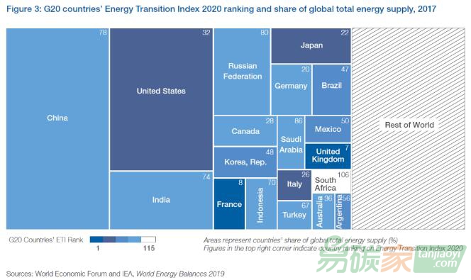 世界經濟論壇的報告評估了115個國家的能源轉型指數,這些國家占全球人口的90%,占全球能源供應總量的93%,占全球名義GDP的98%。2020年能源轉型指數排在前10名的國家是:瑞典、瑞士、芬蘭、丹麥、挪威、奧地利、英國、法國、荷蘭、冰島。