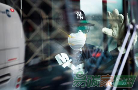 公交車司機戴著口罩保護自己免受冠狀病毒的侵害。