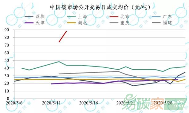 上海碳價出現了一定的波動,最高達到了48.5元/噸,最低下跌到35.6元/噸,截至5月底上海碳價報收41.9元/噸。
