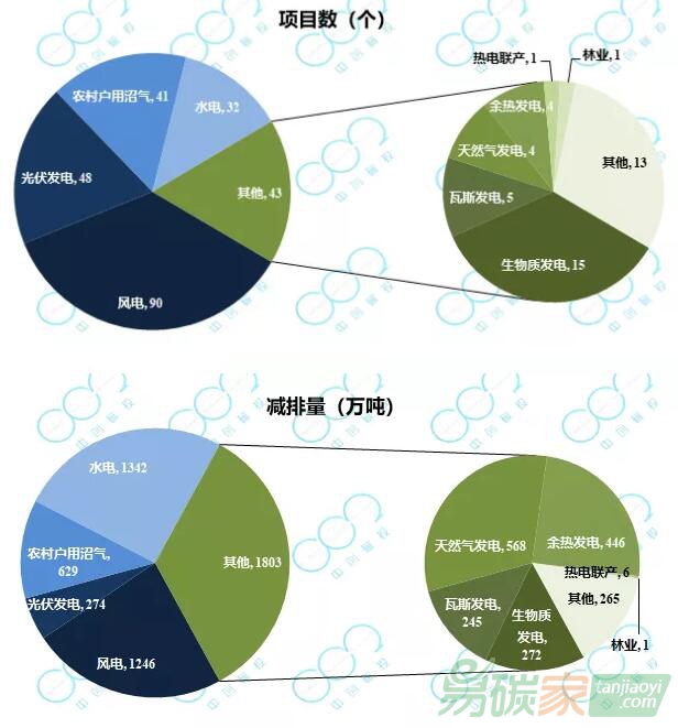 從項目類別看,已獲得減排量備案且材料公示的254個項目中,有第一類項目139個,合計備案減排量1890萬噸CO2e;第二類項目17個,備案減排量372萬噸CO2e;第三類項目98個,備案減排量3031萬噸CO2e。從項目類型看,風電、光伏、農村戶用沼氣、水電等項目較多,詳細情況如下圖所示: