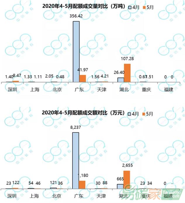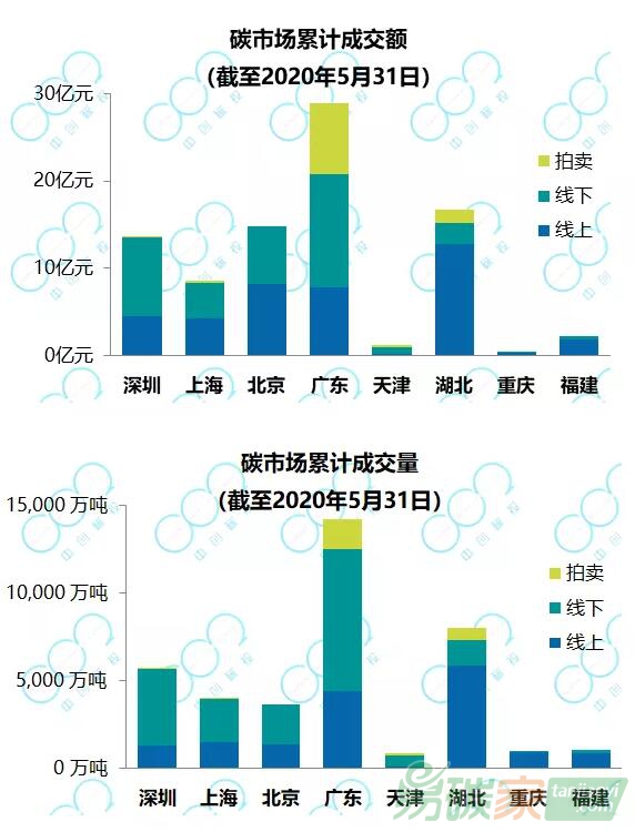 截至2020年5月31日,配額現貨累計成交3.83億噸,成交額86.1億元。湖北、廣東累計成交量最高,位于第一梯隊;深圳、上海、北京位于第二梯隊;天津、重慶、福建累計成交量相對較低,位于第三梯隊。
