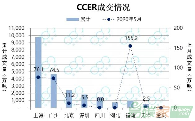 截至2020年5月31日,全國CCER累計成交2.2億噸。其中上海CCER累計成交量持續領跑,達9761萬噸,占比44%;廣東CCER累計成交4688萬噸,排名第二,占比21%;北京、深圳和
