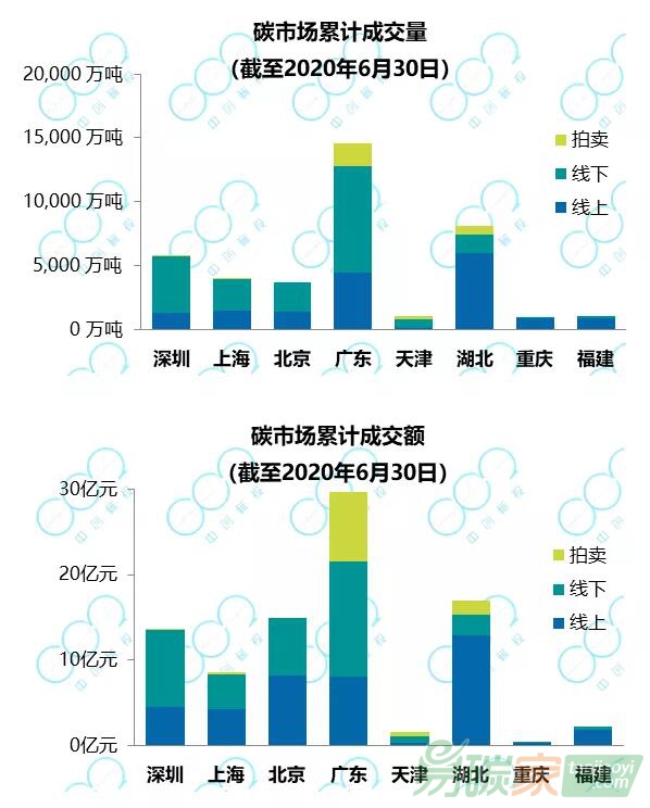 截至2020年6月30日,配額現貨累計成交3.9億噸,成交額87.7億元。湖北、廣東累計成交量最高,位于第一梯隊;深圳、上海、北京位于第二梯隊;天津、重慶、福建累計成交量相對較低,位于第三梯隊。