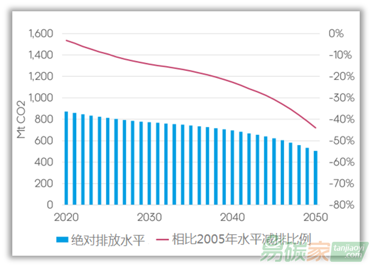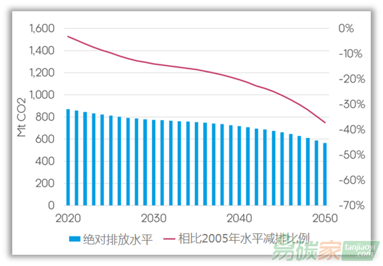 2050年也將出現類似情況:為彌補交通和建筑物減排的不足,現有ETS納管行業的排放量需減少73%,以實現ETS排放量與2005年相比減少63%的整體目標。
