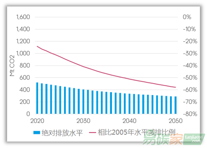 到2030年公路交通排放預計將比2005年水平低14%左右;而建筑物(主要為采暖)排放將比2005年水平低34%。到2050年公路交通和建筑排放預計分別低于2005年水平的37%和41%,絕對CO2排放分別略高于5.5億噸和4億噸。