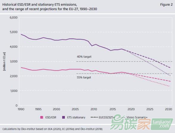 圖3 Agora報告中歐盟歷史排放量以及40%和55%的2030減排目標示意圖(碳市場和非碳市場行業, 百萬噸)