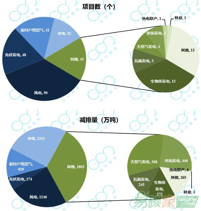 從項(xiàng)目類別看,已獲得減排量備案且材料公示的254個(gè)項(xiàng)目中,有第一類項(xiàng)目139個(gè),合計(jì)備案減排量1890萬(wàn)噸CO2e;第二類項(xiàng)目17個(gè),備案減排量372萬(wàn)噸CO2e;第三類項(xiàng)目98個(gè),備案減排量3031萬(wàn)噸CO2e。從項(xiàng)目類型看,風(fēng)電、光伏、農(nóng)村戶用沼氣、水電等項(xiàng)目較多,詳細(xì)情況如下圖所示: