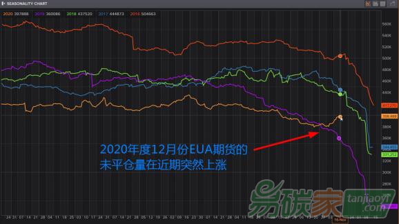 碳市場(chǎng)近期的走勢(shì)中,也稍微反映了這一緊張情緒。下圖3顯示了2016年以來 12月份EUA期貨的未平倉(cāng)量Open Interest走勢(shì)。一般來說,12月份EUA期貨都是在12月中旬左右到期交割,在那之前,期貨持有者會(huì)陸續(xù)的平倉(cāng),所以O(shè)pen Interest在進(jìn)入11月份之后會(huì)陸續(xù)走低。然而,最近兩周以來,2020年度12月份EUA期貨的Open Interest反而略有上漲,這一反常的走勢(shì),也許表明有市場(chǎng)參與者增加對(duì)本年度的EUA期貨持倉(cāng),從而在12月中旬能夠交割而獲取第三階段的EUA配額。