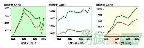 注:綠色折線代表城市二氧化碳總排放,紅色折線代表二氧化碳直接排放。