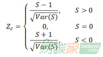 其中,xj為最大值年份后城市排放時(shí)間序列X的第j個(gè)數(shù)據(jù)值;n為最大值年份后城市的數(shù)據(jù)量(年數(shù));sgn是符號(hào)函數(shù);統(tǒng)計(jì)量S大致地服從正態(tài)分布,其均值為0,方差為: