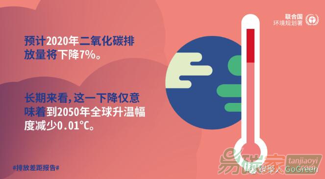 碳排放總量將下降7%。但是,這一降幅僅僅意味著到2050年全球升溫幅度降低0.01℃,世界仍朝著截至本世紀(jì)末升溫突破3℃的方向發(fā)展。