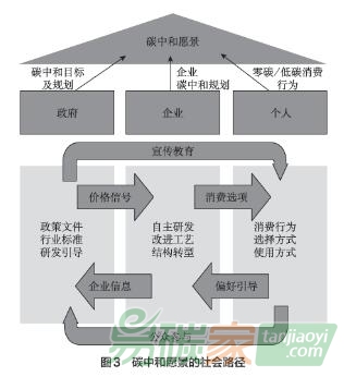 碳中和目標的實現離不開社會的良性互動,政府、企業、個人分別在邁向碳中和愿景進程中具有至關重要而又各有側重的作用(圖3)。