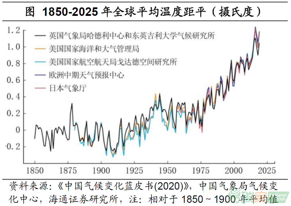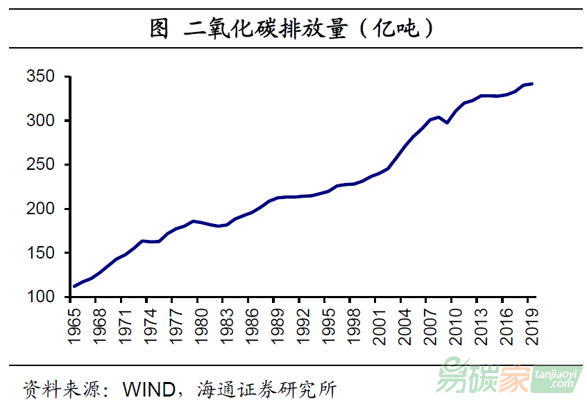 碳排放強度不減,氣候變暖威脅襲來。進入工業化時代,全球二氧化碳(CO2)的排放強度急劇提升。2019年全球CO2排放量達到341.7億噸,是1965年的3.1倍,尤其是2000年以來增速明顯提升。隨著CO2濃度的短期劇增,全球氣溫快速升高。而一旦氣候加速變暖,風暴、熱浪等極端天氣頻繁襲來,不僅危及人類生活,也會造成較大規模的經濟損失。