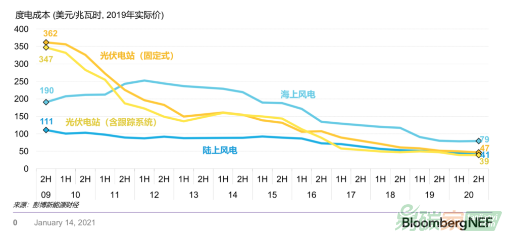 過去十年,光伏和風電的度電成本分別下降了約八成和四成,且仍有進一步下降空間。