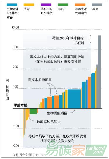 事實上,這條線最左側下方顯示的,是已經盈利的減排案例,如上面所言的小型提能效項目,它們能帶給投資人市場回報率。但是,如果荷蘭擬在2050年以前實現減排目標,則必須推動零成本線以上的能源項目,譬如使用捕碳封存技術、開發高成本風電項目等,而它們可能盈利不佳,甚至完全無法盈利。