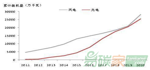 圖|過去十年我國光伏、風電累計裝機量資料來源:《中國能源大數據報告(2020)》