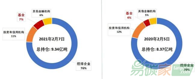 圖4 2020年和2021年2月歐洲碳市場各類型機構持倉份額(ICE洲際交易所)