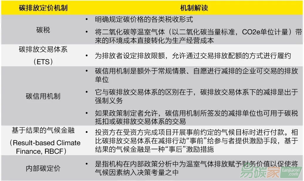 在以上五種方法中,碳稅與碳排放交易體系是最為成熟,也是應用最為廣泛的兩種碳排放定價機制。二者在原理、傳導機制、效果等方面各具特色。