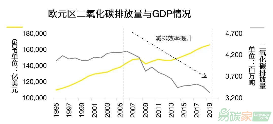 歐盟碳排放交易體系對于歐洲碳排放總量的降低以及減排效率均有正向作用。與歐盟碳排放交易體系建立之初的2005年相比,2019年歐盟碳排放量為33.30億噸,下降20%;除了總量的減少外,歐盟降碳減排的速率也較歷史時期更為高效。