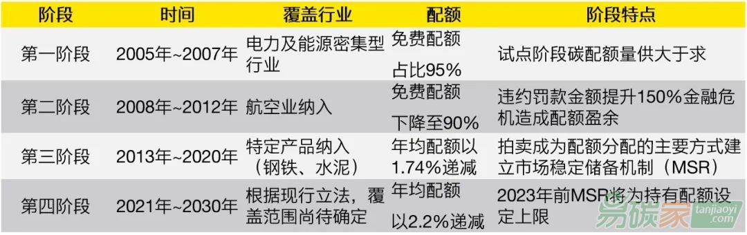 自2005年建立,歐盟碳排放交易體系的發展可以概括為以下四個階段: