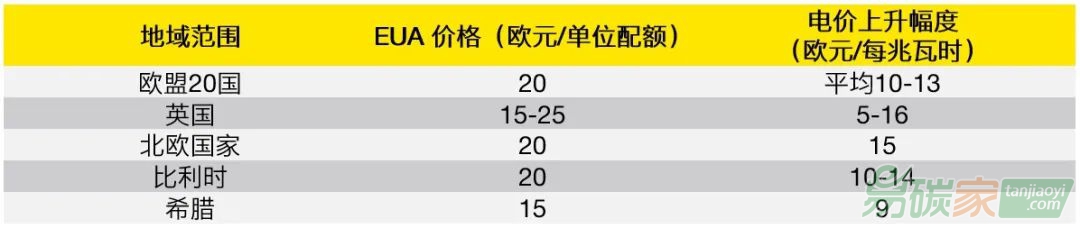 作為電力行業的企業成本,歐洲碳排放配額的價格會傳導至電力價格。趙盟等(2012)在《EU ETS對歐洲電力行業的影響以及對我國的建議》中對歐洲主要經濟體電力價格受到歐洲碳排配額價格影響進行了分析,如下表所示:
