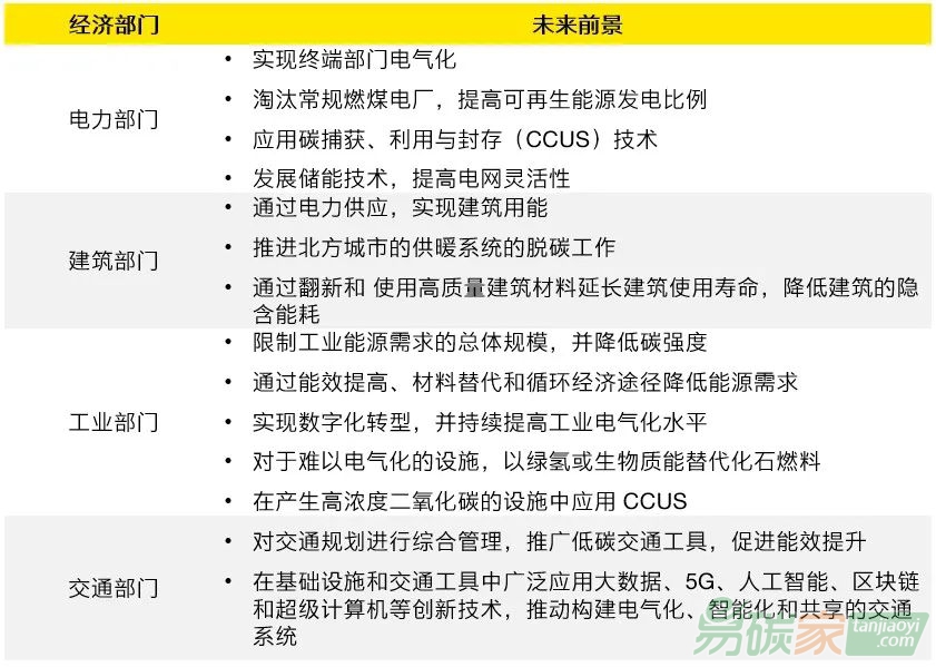 碳排放交易體系的建立對于各經濟部門也帶來了挑戰與機遇。對于電力及能源密集型行業,提高能效、降低排放是應對碳排放交易體系的最基本的應對措施,根據能源基金會《中國碳中和綜合報告2020》,電力、建筑、工業、交通等四個經濟部門可以通過以下途徑實現能效提高和降低排放。