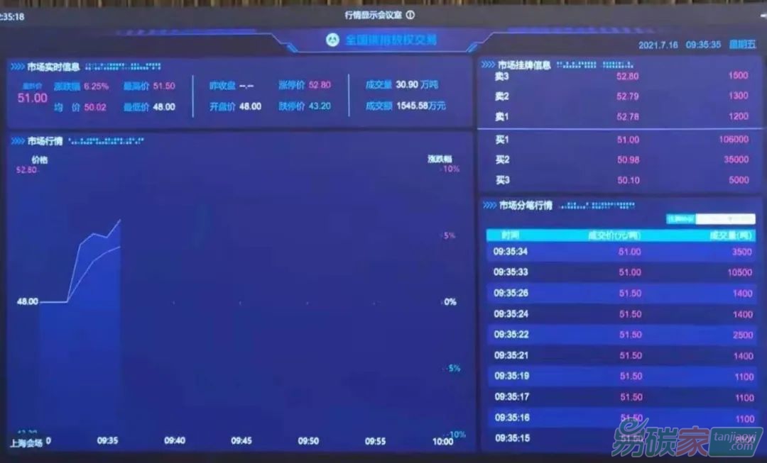 全國碳排放權(quán)交易面板顯示,全國碳市場開盤價為48.00元/噸,開盤后快速上漲至50元以上,并在買一位置出現(xiàn)了106000噸的買入大單,整體成交較為活躍,每分鐘產(chǎn)生數(shù)筆成交。