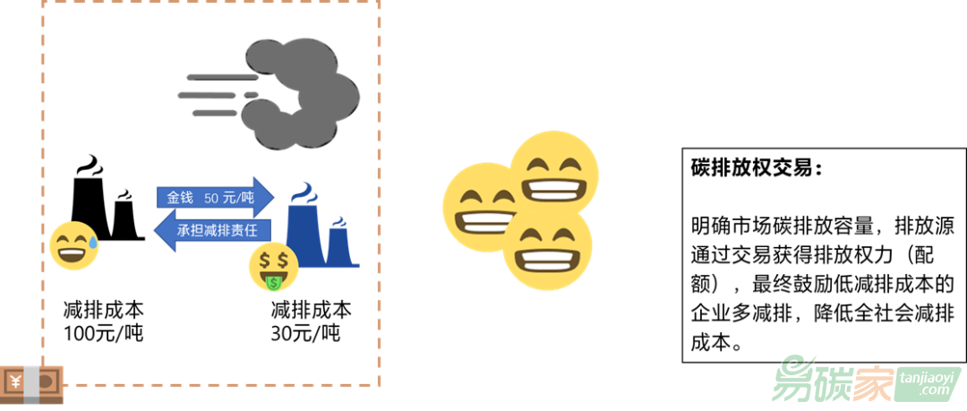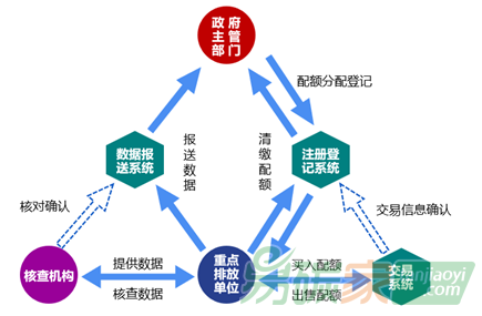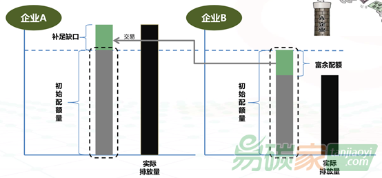 政府會向重點(diǎn)排放單位(現(xiàn)階段為電力企業(yè))發(fā)放配額,企業(yè)要向政府提交和自己排放相等的配額,配額不足的話將受到政府懲罰。對于排放量低于政府配額的企業(yè),高于排放量的配額可以出售;對于排放量高于配額量的企業(yè),需要從市場購買配額。