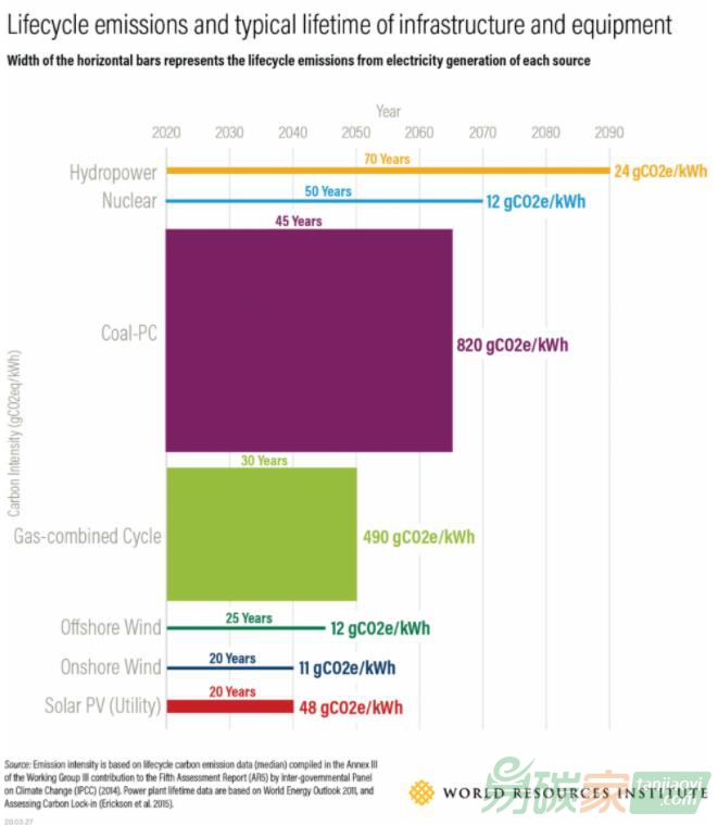電力公司需要建設新的發電廠以滿足不斷增長的電力需求,那么最終投建的電廠類型將帶來截然不同的排放結果。如下圖所示,即便假設每個發電廠每年在其各自的生命周期內能提供相同數量的電力,不同類型的發電廠所帶來的排放量也有顯著差異。以單位發電量產生的溫室氣體排放為例,一座預期使用壽命為50年的核電站,每千瓦時僅產生 12克溫室氣體 排放(gCO2e/kWh),而一座預期使用壽命為45年的化石燃煤電廠將產生前者68倍的溫室氣體排放 (820 gCO2e/kWh)。同樣,一座使用壽命為30年的天然氣聯合循環發電廠的排放量 (490 gCO2e/kWh) 是一座壽命為25年的海上風電設施的40倍以上 (12 gCO2e/kWh)。