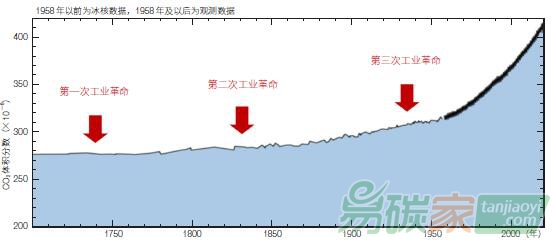 圖1 第一次工業革命以來全球大氣中CO2 體積分數變化