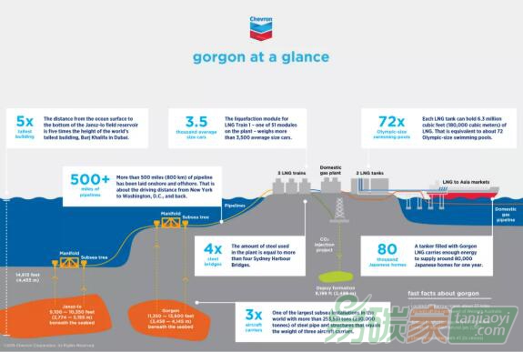 2009年,雪佛龍(Chevron)Gorgon液化天然氣(LNG)項目正式受到西澳大利亞州政府的批準,該項目全球最大的天然氣項目之一,價值550億美元,設計年產能達到1560萬噸LNG。該項目位于澳大利亞西北部的巴羅島自然保護區,距離西澳大利亞海岸約60公里,由Gorgon和Jansz-Io近海油田提供能源。Gorgon項目由雪佛龍澳大利亞子公司運營,持股47.3%,合伙人包括埃克森美孚(25%)和殼牌的澳大利亞子公司(25%),大阪燃氣 (1.25%)、東京燃氣 (1%) 和 JERA (0.417%)。Gorgon項目的LNG主要面向亞洲
