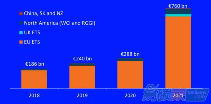 圖:全球各大碳市場2018-2021成交總額一覽