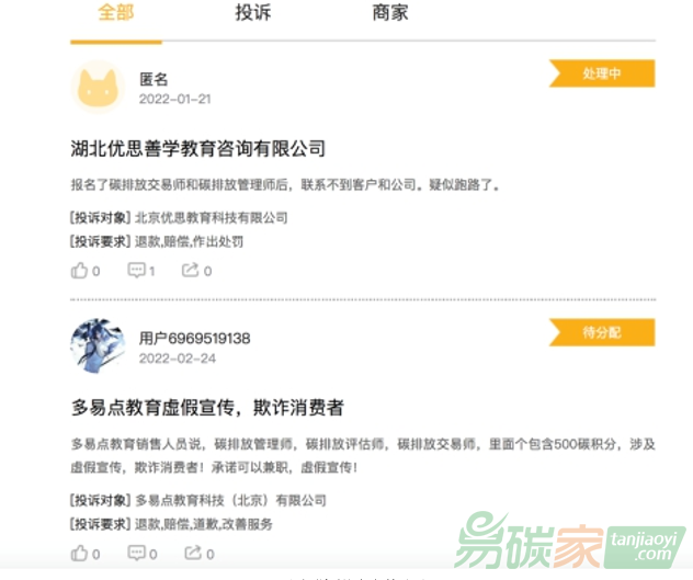 近日,貝殼財經記者在黑貓投訴平臺瀏覽發現,關于碳排放管理師培訓的投訴已有100多起。投訴時間集中于去年11月至今,