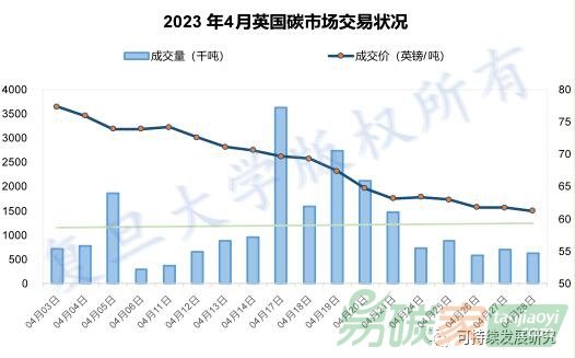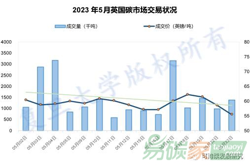 碳市場(chǎng)均價(jià)環(huán)比4月大幅下跌。5月英國碳市場(chǎng)日均成交價(jià)為59.25英鎊/噸,相較于4月的68.64英鎊/噸,環(huán)比下跌13.67%。在絕對(duì)價(jià)方面,5月成交價(jià)從月初的60.40英鎊/噸下跌至5月23日的55.45英鎊/噸,累計(jì)跌幅8.20%。相比2022年5月日均碳價(jià)的83.85英鎊/噸,同比下降29.33%??傮w來看,英國碳市場(chǎng)5月均價(jià)已跌破2022年均價(jià)區(qū)間,2023年2月至今碳價(jià)持續(xù)下降,且5月跌幅繼續(xù)擴(kuò)大。