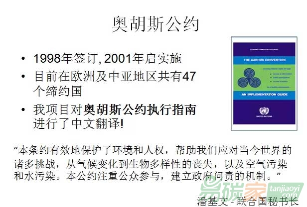 談歐洲國家的環境信息公開,必須要先介紹《奧胡斯公約》。該公約是歐洲最重要的環境和公眾參與方面的法律,現在已有47個締約國。歐盟只有20多成員國,其余20多個不是歐洲的,中亞的哈薩克斯坦也是締約國。該公約已經生效十多年了,歐洲很多國家沒有達到公約中的一些要求。我建議大家看看正文,我們已翻譯成中文,它還配套了200頁的《執行指南》,收納了締約國的最佳經驗。